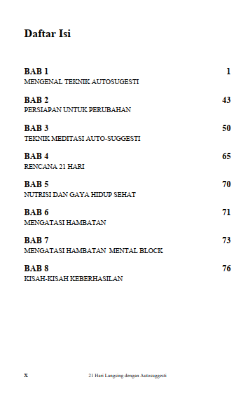 Buku ini menyajikan panduan 21 hari menuju langsing dengan metode autosugesti. Dengan mengikuti acuan pada buku ini, pembaca dapat menjalani proses perubahan yang tidak hanya berdampak pada tubuh, tetapi juga menyentuh aspek mental dan emosional. Setiap harinya, Anda dipandu untuk: