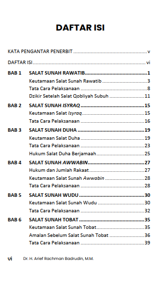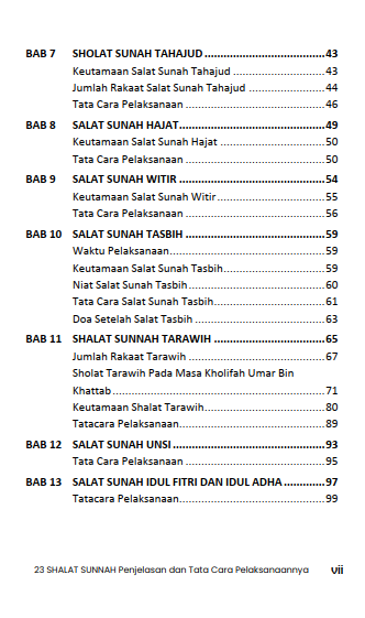 Buku berjudul 23 SALAT SUNAH Penjelasan dan Tata-Cara Pelaksanaannya Buku ini terdiri dari 23 tuntunan salat sunah beserta dengan penjelasan serta tata cara pelaksanaannya. Mulai dari salat sunah rawatib, salat sunah duha, salat sunah awwabin, salat sunah wudu, dan sebagainya.