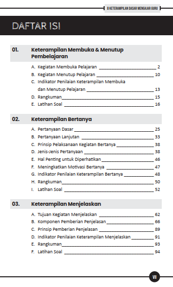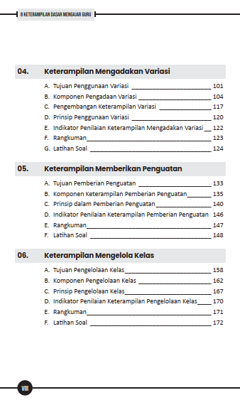 Buku 8 Keterampilan Dasar Mengajar Guru ini tersusun atas delapan bab, dengan sajian materi meliputi keterampilan membuka dan menutup pelajaran, keterampilan bertanya, keterampilan menjelaskan, keterampilan mengadakan variasi, keterampilan memberikan penguatan, keterampilan mengelola kelas, keterampilan membimbing diskusi kelompok kecil, hingga keterampilan mengajar kelompok kecil dan perorangan. Buku ini juga dilengkapi dengan latihan soal dan kunci jawaban untuk memudahkan proses pembelajaran. Semoga buku ini bermanfaat bagi segenap pembaca, khususnya kalangan tenaga pendidik. Selamat membaca!