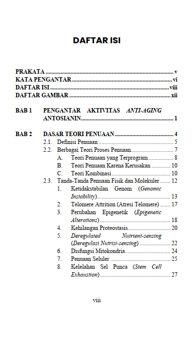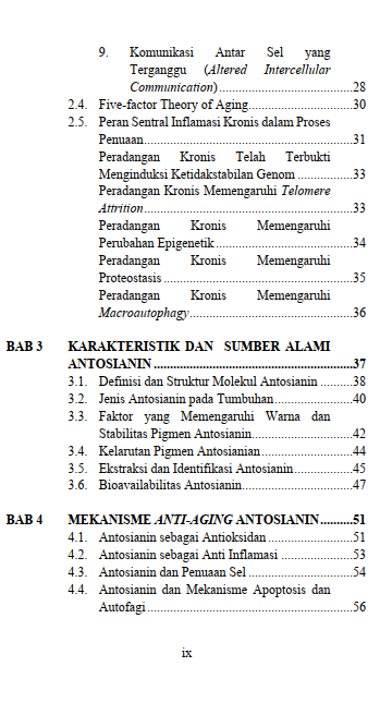 Buku Aktivitas Anti-aging Antosianin ini disusun sebagai upaya untuk mengupas secara mendalam potensi antosianin sebagai senyawa alami yang efektif dalam memperlambat proses penuaan dan meningkatkan kualitas hidup manusia. Buku ini membahas secara mendalam bagaimana antosianin, melalui aktivitas antioksidan dan anti-inflamasi yang dimilikinya, mampu menangkal radikal bebas, memperlambat proses degeneratif, serta melindungi kulit dari kerusakan akibat paparan sinar ultraviolet (UV). Lebih jauh lagi, buku ini menyoroti peran antosianin dalam mendukung regenerasi sel dan jaringan sebagai fondasi dari proses penuaan yang sehat.