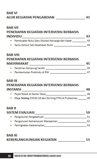 Semoga kehadiran buku ini dapat memberikan manfaat yang luas, memperkaya khazanah literatur pengabdian kepada masyarakat, serta mendorong lahirnya inovasi-inovasi baru berdasarkan evidence-based yang lebih berdampak di masa depan. Selamat membaca!