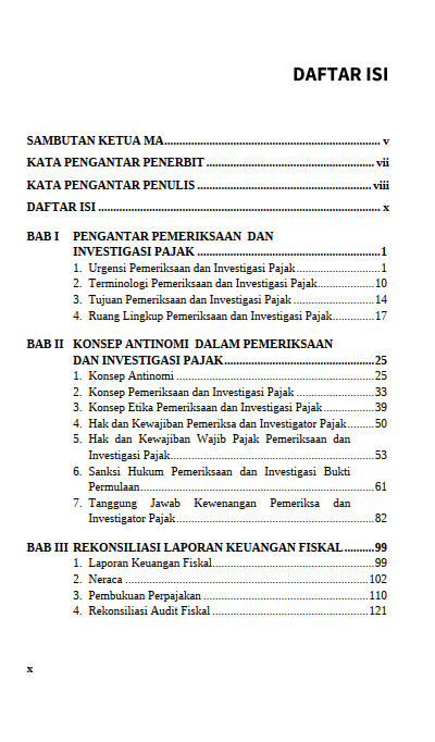 Kemajuan teknologi dan globalisasi telah membawa tantangan baru bagi otoritas pajak, memicu perlunya strategi penyelidikan yang lebih canggih untuk mengantisipasi upaya penghindaran pajak. Terlebih, fenomena ini menimbulkan kompleksitas dalam penegakan hukum di bidang perpajakan. Untuk itu, buku ini menguraikan istilah-istilah dasar dalam investigasi perpajakan guna memastikan pemahaman yang kuat sebelum melangkah lebih jauh dalam proses penyelidikan. Secara keseluruhan, buku ini memberikan pandangan yang mendalam terhadap prinsip-prinsip yuridis fiskal yang mendasari Investigasi dan Pemeriksaan Pajak. Tujuannya adalah memberikan pemahaman yang utuh tentang peran penting pemeriksa pajak sebagai penjaga keadilan di tengah dinamika hukum dan teknologi yang terus berkembang.