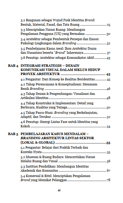 Buku ini mengajak Anda menjelajahi pertemuan lintas disiplin antara arsitektur dan desain komunikasi visual (DKV), membuka wawasan tentang pentingnya branding dalam menciptakan ruang yang autentik, penuh karakter, dan berkesan. Dari teori hingga praktik, dari prinsip desain hingga contoh kasus ikonik, Anda dapat menemukan peta lengkap bagaimana menjadikan setiap bangunan sebagai entitas hidup yang memiliki suara dan narasi.