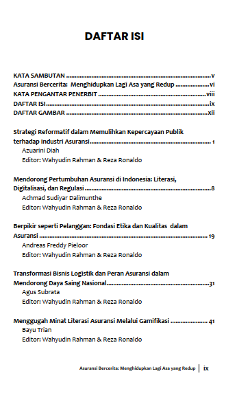 Buku ini menghadirkan antologi gagasan strategis yang menyoroti urgensi reformasi menyeluruh dalam industri asuransi Indonesia. Melalui pendekatan multidisipliner, para penulis membahas cara membangkitkan kembali kepercayaan publik, mendorong transformasi digital, memperkuat regulasi, serta menegakkan etika bisnis. Beberapa bab mengeksplorasi solusi konkret seperti gamifikasi untuk literasi, optimalisasi manajemen risiko, pemberdayaan agen dan pialang, hingga kontribusi asuransi syariah dalam mendukung ekonomi umat.
