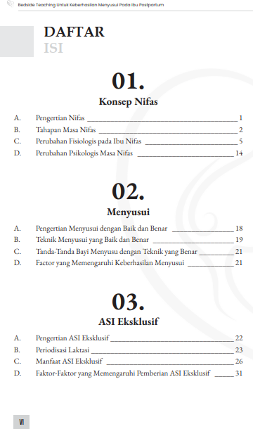 Buku Bedside Teaching untuk Keberhasilan Menyusui pada Ibu Postpartumini menyajikan materi mulai dari pemahaman tentang nifas, pengertian dan teknik menyusui yang benar, pentingnya ASI eksklusif, pemahaman tentang fisiologi bayi, masalah kesehatan yang lazim pada bayi, hingga tujuan dan keunggulan bedside teaching dalam keberhasilan menyusui. Semoga buku ini mampu menjadi pedoman yang bermanfaat bagi perawat dan tenaga kesehatan dalam memberikan edukasi kepada ibu menyusui. Selamat membaca!