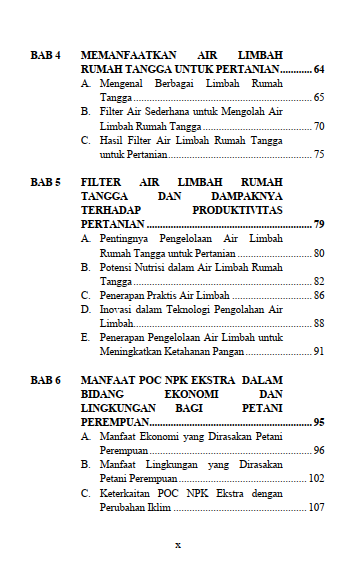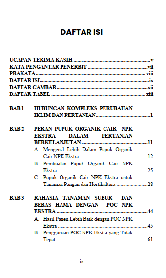 Perubahan iklim mengarah pada perubahan pola perilaku iklim dalam jangka waktu panjang, bahkan bertahun-tahun. Perubahan ini seringkali dikaitkan dengan pemanasan global atau produksi gas rumah kaca yang semakin bertambah di atmosfer. Hal ini diakibatkan oleh aktivitas manusia, baik langsung maupun tidak langsung, berpengaruh terhadap perubahan atmosfer secara global. Salah satu aktivitas manusia yang berkaitan dengan potensi pemanasan global adalah penggunaan pupuk dan pestisida kimia sintetis dalam sektor pertanian. Oleh karena itu, salah satu pencegahan yang dapat dilakukan adalah dengan menerapkan pertanian adaptif. Melalui buku ini, pembaca akan mengetahui cara menerapkan pertanian adaptif melalui aplikasi pupuk organik cair (POC) NPK ekstra dan teknik filter air limbah. Buku ini juga menjelaskan peran POC NPK Ekstra yang terbukti mampu meningkatkan produktivitas hasil pertanian. Setelah membaca buku secara keseluruhan, pembaca akan mengetahui cara atau prosedur pembuatan filter air limbah rumah tangga sederhana yang dapat menunjang kesuksesan pertanian berkelanjutan meskipun sedang dilanda perubahan musim.