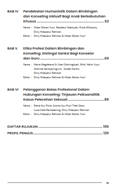 Buku “Bimbingan dan Konseling dalam Jejak Pemikiran Klasik hingga Tantangan Praktik Kontemporer” menyajikan telaah komprehensif mengenai perkembangan bimbingan dan konseling dari akar pemikiran klasik hingga dinamika penerapannya di era modern. Pembaca diajak memahami landasan filosofis, teori-teori utama, serta kontribusi tokoh-tokoh penting yang membentuk arah keilmuan bimbingan dan konseling. Tidak hanya bersifat teoretis, buku ini juga mengulas berbagai tantangan praktik kontemporer, seperti perubahan karaktek, perkembangan teknologi, serta tuntutan profesionalisme konselor di era digital. Disusun secara sistematis dan mudah dipahami, buku ini menjadi referensi penting bagi mahasiswa, pendidik, konselor, serta praktisi yang ingin memperkuat pemahaman konseptual sekaligus meningkatkan kualitas layanan bimbingan dan konseling secara relevan dengan kebutuhan zaman.