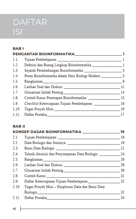 Buku BIOINFORMATIKA: DASAR, APLIKASI, DAN INOVASI DALAM ANALISIS BIOLOGI adalah panduan komprehensif yang menjembatani ilmu biologi dan komputasi. Mulai dari memahami sejarah dan ruang lingkup disiplin ilmu bioinformatika, Anda akan dibimbing untuk menguasai konsep dasar, termasuk eksplorasi basis data vital, hingga menguasai aplikasi inti yang ada di dalam buku ini.