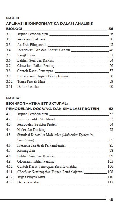 Pelajari teknik krusial seperti Penjajaran Sekuens (menggunakan alat populer seperti BLAST dan Clustal Omega) dan Analisis Filogenetik, yang menjadi fondasi dalam penelitian genomik dan proteomik. Buku ini dirancang dengan struktur yang fokus pada praktik, dilengkapi tujuan pembelajaran yang jelas, contoh kasus nyata, dan tugas proyek mini di setiap babnya.