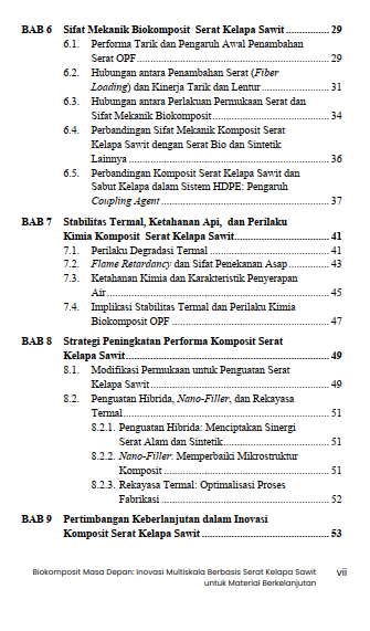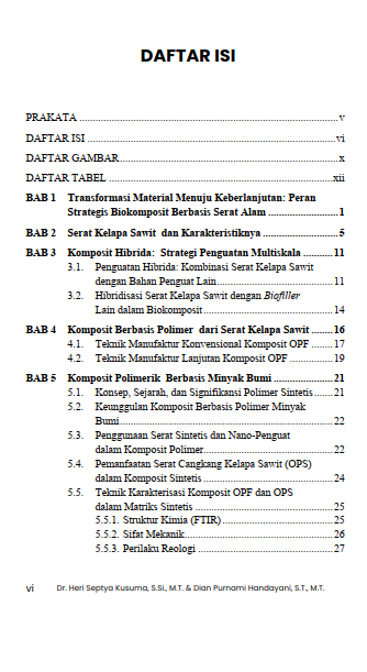 Buku ini disusun untuk memberikan pemahaman yang menyeluruh mengenai sifat, karakteristik, serta aplikasi biokomposit berbasis OPF dalam berbagai sistem matriks polimer. Pembahasan dimulai dari karakteristik dasar OPF, strategi penguatan multiskala, klasifikasi matriks sintetis dan alami, hingga teknik manufaktur konvensional maupun lanjutan seperti teknologi cetak 3D. Buku ini juga menguraikan secara rinci aspek mekanik, termal, kimia, dan lingkungan yang menjadi penentu performa akhir dari biokomposit OPF. Struktur isi buku disusun secara sistematis dan tematis untuk memudahkan pembaca dalam menelusuri perkembangan ilmu, tantangan teknis, serta prospek masa depan dari material berbasis serat kelapa sawit. Setiap bab dilengkapi dengan pendalaman kasus dan referensi terkini yang diharapkan dapat menjadi landasan kuat bagi penelitian lanjutan, pengembangan produk industri, serta pembelajaran di lingkungan akademik.