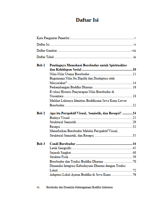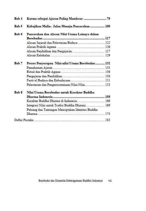 Borobudur merupakan warisan budaya visual dan spiritual yang memuat ajaran Buddha dalam bentuk struktur, simbol, dan narasi relief. Nilai-nilai utamanya yang terdiri dari karma, kebajikan mulia, dan pencerahan, dihidupkan kembali oleh beragam tradisi Buddhis di Indonesia melalui pemahaman ajaran, ritual, pendidikan, dan praktik kehidupan sehari-hari. Borobudur tampil bukan hanya sebagai monumen, tetapi sebagai teks visual pedagogis yang membimbing perjalanan batin secara bertahap. Memaknai nilai-nilai utama Borobudur dilakukan menggunakan perspektif visual, semiotik, dan resepsi, sehingga muncul pemahaman mengenai bagaimana makna-maknanya diolah, ditafsirkan, dan direproduksi oleh individu maupun komunitas. Selama proses penyerapan nilai berlangsung, karakter Buddha Dharma Nusantara pun terbentuk sebagai wujud keberagamaan yang akomodatif, toleran, dan berakar pada budaya lokal tanpa meninggalkan esensi ajaran. Melalui pembahasan yang holistik dari semua itu, buku ini diharapkan dapat memperkaya kajian filsafat Buddha, seni Buddhis, dan sosiologi agama, serta menjadi rujukan bagi lembaga keagamaan, pendidikan, dan masyarakat luas dalam memahami Borobudur sebagai sumber nilai, identitas, dan inspirasi bagi kehidupan bersama di Indonesia yang majemuk.