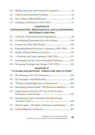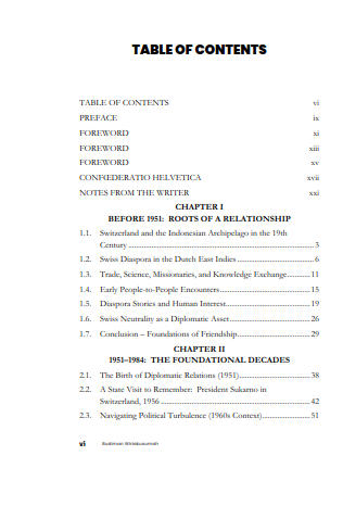 Bridging Nations, Connecting Hearts is a reflective and forward-looking book that commemorates the 75th anniversary of diplomatic relations between Indonesia and Switzerland by weaving together archival exploration, bilateral milestones, and lived experience. Centered on the concept of people-to-people diplomacy, the book highlights how trust, education, cultural exchange, and individual dedication have shaped the Indonesia–Switzerland partnership beyond formal agreements. Moving from historical roots to contemporary challenges, it also explores the future of diplomacy through themes such as digital transformation, ethical innovation, health, and sustainability, offering a personal and philosophical vision for the next generation. The book ultimately affirms that diplomacy endures not only through institutions, but through human connection, service, and shared values.
