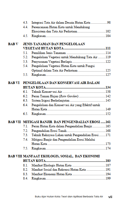Buku ajar ini secara komprehensif membahas berbagai aspek terkait hutan kota dan tata air, mulai dari konsep dasar hingga penerapan teknologi terkini. Materi yang disajikan mencakup perencanaan dan desain hutan kota, pemilihan jenis tanaman, pengelolaan vegetasi, dan berbagai teknik konservasi air. Dengan pemahaman yang mendalam mengenai materi-materi tersebut, pembaca diharapkan dapat berperan aktif dalam upaya pelestarian lingkungan dan pembangunan kota yang berkelanjutan.