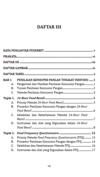 Penilaian konsumsi pangan adalah kegiatan pengukuran konsumsi makanan pada individu, keluarga, maupun kelompok masyarakat dengan menggunakan metode pengukuran yang sistematis, menilai dan mengevaluasi asupan zat gizinya sebagai salah satu cara penilaian status gizi secara tidak langsung. Penilaian konsumsi pangan digunakan untuk menentukan jumlah dan sumber zat gizi yang dikonsumsi serta membantu menunjukkan apakah makanan yang sudah dikonsumsi tergolong cukup, kurang, atau berlebih. Oleh karena itu penilaian konsumsi pangan menjadi salah satu alasan penting dalam menelaah dampak penyerta bagi gizi dan kesehatan. Penilaian konsumsi pangan merupakan salah satu pendekatan yang digunakan untuk menilai status gizi seseorang selain menggunakan antropometri, parameter biokimia, dan pemeriksaan klinis (Gibson, 2005). Metode ini merupakan metode penilaian status gizi secara tidak langsung. Tujuan dari kegiatan ini adalah untuk memberikan gambaran mengenai kondisi asupan zat gizi pada individu, keluarga, maupun kelompok saat ini dan masa lalu sehingga dapat mencerminkan status gizi di masa yang akan datang. Status asupan zat gizi saat ini (cukup, kurang, atau berlebih) yang diketahui dari kuantitas dan kualitas makanan yang biasa dikonsumsi akan dapat membantu menggambarkan status gizi di masa yang akan datang. Tujuan penyusunan buku ajar ini adalah untuk memberikan tambahan referensi bagi mahasiswa pada mata kuliah Penilaian Konsumsi Pangan.