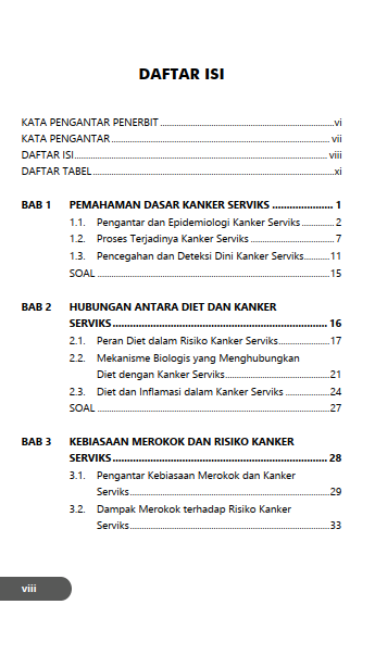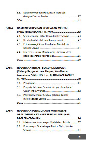 Buku ini menyajikan uraian mengenai cara-cara pencegahan kanker serviks melalui pola hidup sehat dan pemenuhan nutrisi harian. Selain itu, deteksi dini melalui pemeriksaan serta vaksinasi HPV juga dapat dilakukan sebab penderita kanker serviks sering kali tidak merasakan gejala pada tahap awal, yang membuat deteksi dini sangat penting untuk dilakukan.