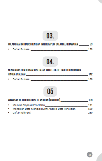 Buku Ajar Transformasi Keperawatan: Kolaborasi, Inovasi, hingga Riset Lanjutan ini menyajikan materi meliputi agen pembaharu dalam keperawatan, audit keperawatan, kolaborasi intradisiplin dan interdisiplin dalam keperawatan, menggagas pendidikan kesehatan yang efektif (dari perencanaan hingga evaluasi), hingga wawasan metodologi riset lanjutan (analitik). Buku ini disertai dengan latihan soal untuk menstimulasi pemahaman pembaca terhadap materi. Semoga buku ini bermanfaat sebagai referensi di bidang ilmu keperawatan yang mampu memperkaya wawasan keilmuan dan khazanah kepustakaan. Selamat membaca!