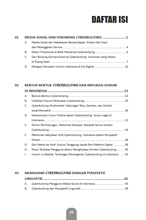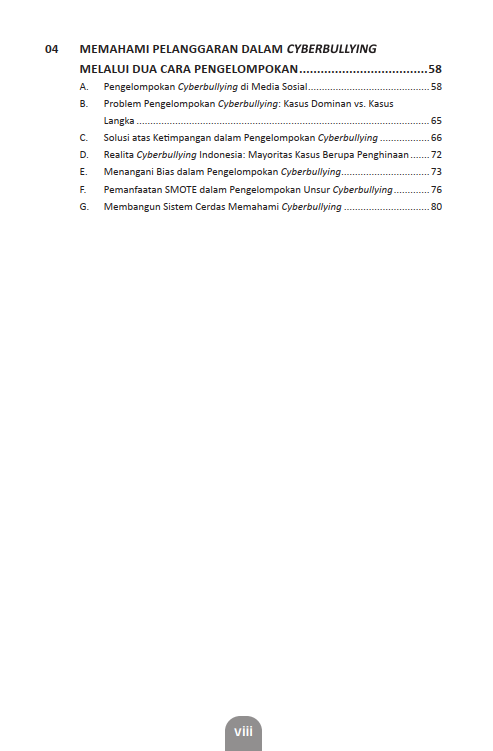 Buku ini mengupas pemanfaatan teknologi kecerdasan buatan untuk mengatasi masalah perundungan siber (cyberbullying). Dengan cara multidisiplin, buku ini mengintegrasikan ilmu dan data canggih berupa penerapan supervised machine learning dalam bidang data mining dengan kajian dari perspektif hukum dan bahasa untuk mengidentifikasi konten berbahaya di dunia maya.