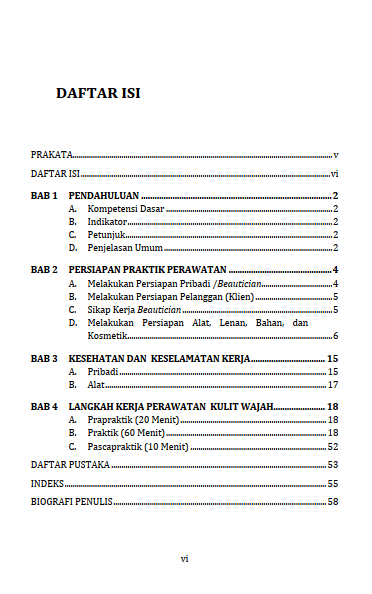 Perawatan kulit wajah bukanlah merupakan sesuatu yang baru. Proses ini telah dikenal sejak dahulu kala dan merupakan suatu unsur kebudayaan masyarakat. Penilaian bentuk dan rupa serta norma-norma kecantikan berkembang sesuai dengan perkembangan zaman, dipengaruhi oleh perkembangan teknologi, keaneka ragaman kosmetika, peralatan dan teknik. Sebelum memulai perawatan wajah, seorang esthetician harus telah siap dengan segala peralatan dan produk rawat yang akan digunakannya. Seorang professional esthetician harus efisien dan terorganisir dengan baik dalam hal waktu, urutan dan kualitas perawatan Buku mengenai pedoman praktik perawatan kulit wajah ini disusun untuk memberikan referensi rangkaian praktik perawatan kulit wajah dengan melaksanakan tahap-tahap perawatan secara runtut, dengan teknik yang sesuai, dan dengan durasi yang cukup untuk mencapai hasil optimum. Dalam buku ini juga dilengkapi dengan contoh kartu diagnosa dan teknik totok wajah untuk mencapai hasil perawatan wajah yang maksimal dan memastikan keamanan pasien/client dalam rangkaian perawatan wajah yang dilakukan.