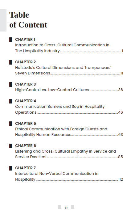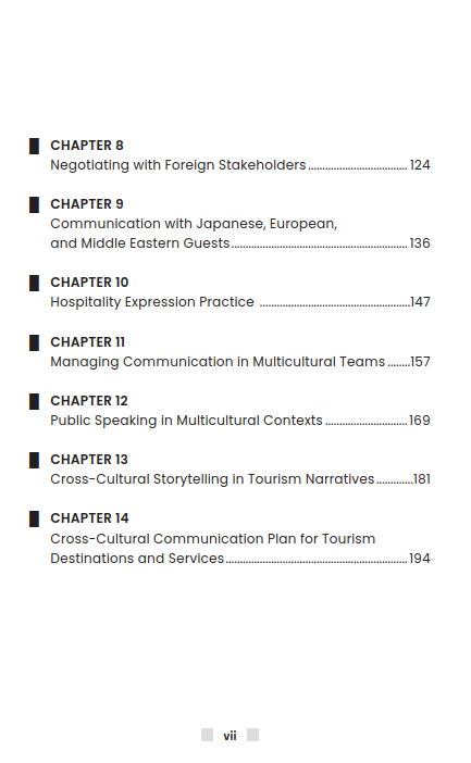 In its final chapters, the book becomes a practical toolkit for global hospitality success. It offers tips for communicating with guests from Japan, Europe, and the Middle East, managing multicultural teams, and speaking confidently in diverse settings. With chapters on storytelling in tourism and hands-on communication practice, the book wraps up by showing readers how to design a complete cross-cultural communication plan: helping them create memorable, culturally sensitive experiences that truly connect with guests from around the world.