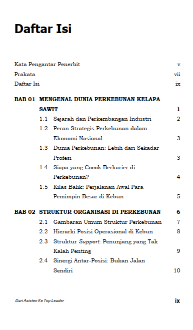 Disarikan dari pengalaman puluhan tahun di lapangan—dari posisi asisten hingga manajer puncak—buku ini dirancang sebagai gambaran referensi karier yang praktis dan inspiratif. Ditujukan bagi setiap profesional di industri perkebunan, buku ini memetakan jalan sukses yang tidak bergantung pada keberuntungan, melainkan pada empat pilar utama: integritas, kompetensi, konsistensi, dan kerendahan hati. Melalui pembahasan prinsip, strategi kepemimpinan, dan contoh peristiwa yang relevan, pembaca akan mendapatkan bekal berharga untuk menavigasi setiap jenjang karier. Baik Anda seorang pemula maupun seorang pemimpin berpengalaman, buku ini menawarkan wawasan untuk tumbuh dan meraih puncak pengabdian di dunia perkebunan.