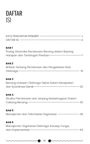 Buku ini mengajak pembaca menyelami kompleksitas dunia pembinaan dan pengelolaan klub renang prestasi, dari sisi teknis olahraga hingga manajerial organisasi. Dengan memadukan pemahaman tentang struktur jenjang olahraga, fungsi manajemen, hingga dinamika kepelatihan, pembaca akan dibimbing memahami bagaimana sebuah klub dapat tumbuh dan berprestasi melalui sistem yang terintegrasi. Di dalamnya tergambar pula peran penting pelatih, atlet, orang tua, dan pengurus klub dalam membangun atmosfer latihan yang kompetitif sekaligus suportif.