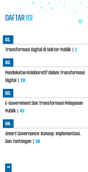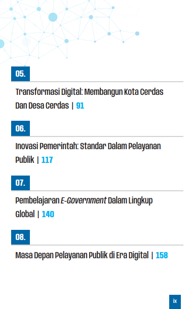 Melalui perjalanan yang terstruktur, buku ini mengupas tentang evolusi e-government, konsep smart governance yang cerdas, serta bagaimana teknologi mewujudkan kota cerdas (smart city) dan desa cerdas (smart village) yang berdaya. Pemaparan serta ulasan mendalam tentang urgensi transformasi digital dalam pelayanan publik, tantangan global yang dihadapi, hingga tren masa depan yang akan membentuk lanskap pemerintahan dalam pelayanan publik. Tidak hanya berhenti pada teori, buku ini juga menyajikan strategi efektif, mitigasi kegagalan, dan contoh kasus inspiratif dari berbagai negara yang telah berhasil menerapkan inovasi pelayanan publik. Dibahas pula peran krusial pemerintah, baik pusat maupun daerah, dalam membangun infrastruktur teknologi dan mendorong ekosistem digital yang inklusif.