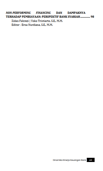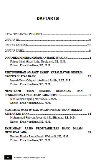 Buku berjudul Dinamika Kinerja Keuangan Bank ini terdiri atas beberapa pokok materi, antara lain dinamika kinerja keuangan bank syariah; pertumbuhan market share sebagai katalisator kinerja profitabilitas bank; menyelami tren kinerja keuangan dan pengaruhnya terhadap laba bersih; Risk Based Bank Rating dalam menentukan tingkat kesehatan bank; eksplorasi rasio profitabilitas bank dalam mencapai laba; serta Non-Performing Financing dan dampaknya terhadap pembiayaan, dilihat dari perspektif bank syariah. Buku ini diharapkan dapat bermanfaat bagi para pembaca dan menjadi referensi yang berguna bagi dunia akademik, industri, serta masyarakat luas dalam memahami materi terkait kinerja keuangan bank