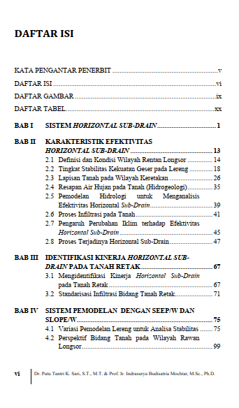 Buku ini memaparkan efektivitas sistem horizontal sub-drain dalam mengendalikan air bawah permukaan pada lereng di daerah dengan curah hujan tinggi, menggunakan strategi cracked soil. Strategi ini mempertimbangkan pengaruh retakan tanah terhadap infiltrasi dan pergerakan air, yang dapat berdampak signifikan pada kestabilan lereng.
