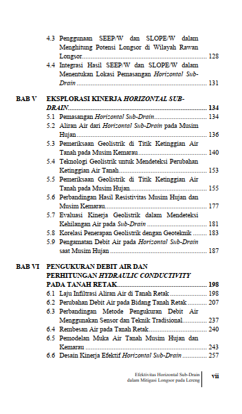 Dengan menggabungkan eksplorasi wilayah, pemodelan numerik, dan eksplorasi geoteknik, buku ini mengulas faktor-faktor utama yang memengaruhi kinerja sub-drain, seperti karakteristik tanah, pola retakan, dan intensitas hujan. Selain itu, pembaca akan mendapatkan wawasan mengenai prinsip desain sub-drain, dengan desain pada kestabilan lereng, serta strategi mitigasi longsor yang berbasis pada karakteristik tanah yang mengalami retakan.