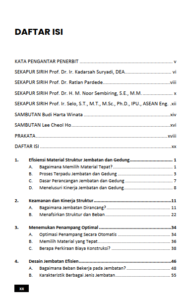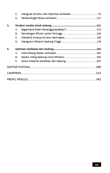 Selain membahas pemilihan material, buku ini menampilkan strategi pengembangan desain yang sistematis dan terstruktur untuk menemukan desain paling efisien. Dengan cara yang runtut, pembaca dapat melihat bagaimana desain bangunan disusun, diukur, dan disesuaikan, mulai dari jembatan dengan berbagai bentang hingga gedung bertingkat. Buku ini memberi gambaran menyeluruh tentang dunia konstruksi dari perspektif praktis, sekaligus tetap berpijak pada standar yang berlaku sehingga menjadi rujukan berguna bagi pembaca yang ingin memahami dasar-dasar pembangunan dengan cermat.