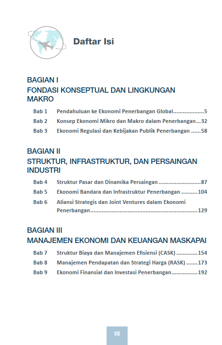 Buku ini dibagi ke dalam lima bagian besar yang saling melengkapi. Dimulai dari fondasi teoretis ekonomi mikro dan makro dalam penerbangan, pembahasan bergerak menuju struktur pasar, dinamika persaingan, infrastruktur bandara, dan strategi aliansi maskapai. Bagian selanjutnya menyoroti aspek manajemen ekonomi maskapai, termasuk tinjauan biaya, manajemen pendapatan, jaringan rute, dan transformasi digital. Pembaca juga diajak memahami isu-isu kontemporer seperti SAF, carbon pricing, Green ATM, elektrifikasi armada, urban air mobility, hingga disrupsi teknologi berbasis AI dan data.