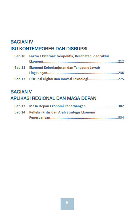 Konteks Indonesia mendapat porsi khusus: tantangan geografis negara kepulauan, struktur biaya yang unik, potensi SAF domestik, integrasi ATFM, konektivitas wilayah 3T, dan peluang Indonesia sebagai pusat penerbangan Asia Pasifik. Analisis diperkuat dengan tren global jangka panjang, refleksi terhadap masa depan mobilitas udara, dan agenda riset untuk menghadapi era baru penerbangan.