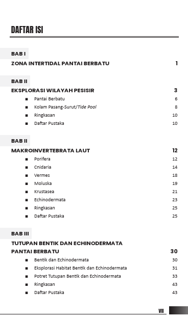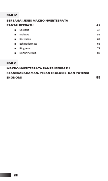 Buku ini menjabarkan tentang hewan-hewan laut, khususnya dari kelompok invertebrata yang umum ditemukan di zona intertidal pantai berbatu. Substrat pantai berbatu dengan kolam-kolam pasang surutnya ternyata menjadi lokasi ideal untuk tumbuh dan berkembangnya berbagai jenis invertebrata. Oleh sebab itu, buku ini memaparkan lebih dalam terkait dengan jenis-jenis makroinvertebrata yang ditemukan di pesisir berbatu serta kelimpahan makroinvertebrata, khususnya dari filum Echinodermata.