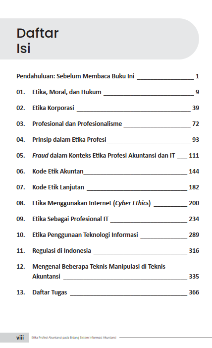 Buku ini menguraikan prinsip-prinsip utama etika profesi akuntansi seperti integritas, objektivitas, kompetensi profesional, kerahasiaan, dan perilaku profesional dalam konteks penggunaan perangkat lunak akuntansi, sistem basis data keuangan, dan teknologi cloud. Pembaca diajak memahami potensi risiko etis dalam penggunaan teknologi, seperti manipulasi data elektronik, penyalahgunaan akses informasi, hingga pelanggaran privasi dan keamanan data klien.
