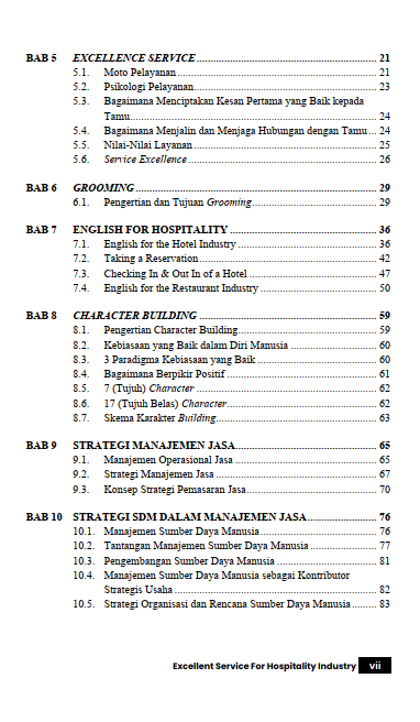 Buku berjudul Excellence Service for Hospitality Industry terdiri dari beberapa bab, antara lain Pengantar Pelayanan, Pengertian Hospitality, Manajemen Kualitas Layanan Jasa, Customer, Excellence Service, Grooming, English for Hospitality, Character Building, Strategi Manajemen Jasa, Strategi Manajemen SDM dalam Manajemen Jasa, dan Pentingnya Service Excellence pada Perusahaan Jasa. Buku ini diharapkan dapat menjadi referensi terkait dengan pelayanan di industri perhotelan.