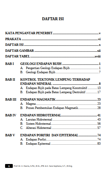 Geologi endapan mineral merupakan salah satu ilmu yang sangat penting dalam mempelajari ilmu kebumian secara komprehensif karena endapan mineral memiliki peranan yang sangat penting dalam menunjang berbagai aktivitas manusia, mulai dari industri, pertanian, kesehatan, energi hingga teknologi. Dengan memahami endapan mineral, kita dapat mengidentifikasi lokasi potensial untuk pertambangan, jenis mineral yang terkandung, dan cara terbaik untuk mengekstraksinya. Buku ini terdiri dari tujuh (7) bab yang membahas secara komprehensif tentang Geologi Endapan Bijih, Kontrol Tektonik Lempeng terhadap Endapan Mineral, Endapan Magmatik, Endapan Hidrotermal, Endapan Porfiri dan Epitermal, Endapan Sedimenter serta Endapan Tembaga-Emas Oksida Besi (Iron Oxide Copper-Gold/IOCG). Buku ini ditulis secara sistematis agar pembaca dapat memahami materi buku ini dengan mudah.