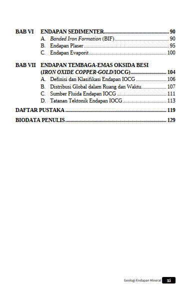 Buku berjudul Geologi Endapan Mineral ini menyediakan informasi kunci tentang sumber daya alam yang esensial dan memberikan pemahaman secara komprehensif tentang proses-proses geologis yang menghasilkan berbagai jenis endapan mineral, termasuk mekanisme pembentukan, distribusi dan karakteristik serta aspek ekonominya. Bahasan dalam buku ini penting bagi para peneliti, mahasiswa, akademisi, dan praktisi di bidang geologi, pertambangan dan industri serta ilmu kebumian lainnya. Buku ini juga dapat menjadi acuan bagi para geologis dan insinyur dalam mencari, menemukan dan mengeksplorasi wilayah-wilayah baru yang belum diteliti agar menemukan sumber daya endapan mineral baru untuk menggantikan sumber daya yang sedang/telah ditambang.