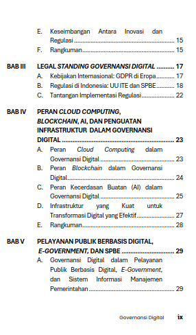 Buku ini berisi untuk memahami konsep governansi digital yang semakin relevan dalam menghadapi tantangan dunia modern. Berbagai tantangan yang dihadapi dalam implementasi governansi digital, seperti isu keamanan data, privasi, serta ketimpangan akses teknologi yang masih menjadi masalah di banyak negara.