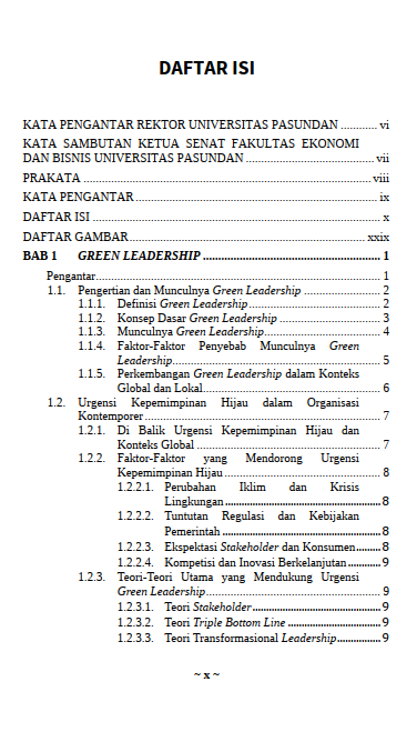 Di tengah tantangan globalisasi dan kemajuan teknologi, isu keberlanjutan lingkungan menjadi perhatian utama. Konsep Kepemimpinan Hijau (Green Leadership) hadir sebagai paradigma baru yang tak sekadar mengejar keuntungan ekonomi, melainkan memprioritaskan keberlanjutan lingkungan dan tanggung jawab sosial. Buku ini dirancang untuk memberikan pemahaman mendalam tentang konsep, teori, praktik, serta tantangan yang dihadapi para pemimpin dalam mengimplementasikan prinsip-prinsip hijau di berbagai sektor. Pembahasan mencakup bagaimana pemimpin dapat mendorong perubahan signifikan, memastikan organisasi dan masyarakat beroperasi secara lebih bertanggung jawab terhadap bumi.