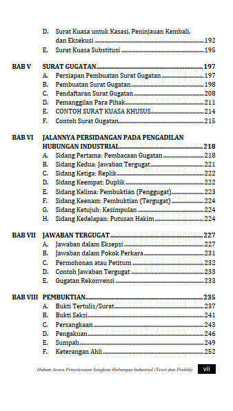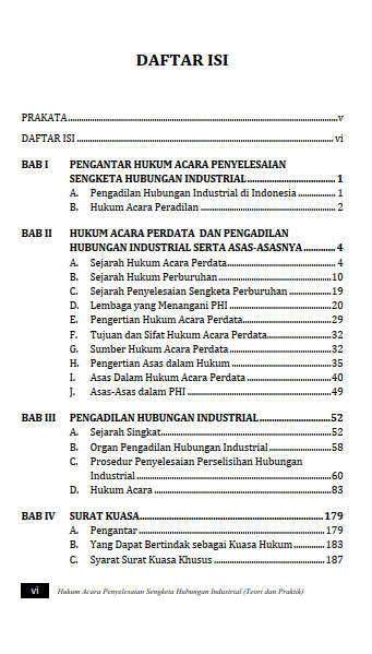 Buku Hukum Acara Penyelesaian Sengketa Hubungan Industrial (Teori dan Praktik) ini terdiri atas 10 (sepuluh) bab, berisi sebagai berikut: Bab I Pengantar Hukum Acara Penyelesaian Sengketa Hubungan Industrial, Bab II tentang Hukum Acara Perdata dan Pengadilan Hubungan Industrial serta Asas-asasnya, Bab III tentang Pengadilan Hubungan Industrial, Bab IV tentang Surat Kuasa, Bab V tentang Surat Gugatan, Bab VI tentang Jalannya Persidangan pada Pengadilan Hubungan Industrial, Bab VII tentang Jawaban Tergugat, Bab VIII tentang Pembuktian, Bab IX tentang Upaya Hukum dan Bab X tentang Eksekusi. Semoga buku ini bermanfaat khususnya bagi kalangan mahasiswa fakultas hukum, praktisi hukum, serta umumnya bagi para pembaca yang meminati Hukum Acara Penyelesaian Sengketa. Selamat membaca!