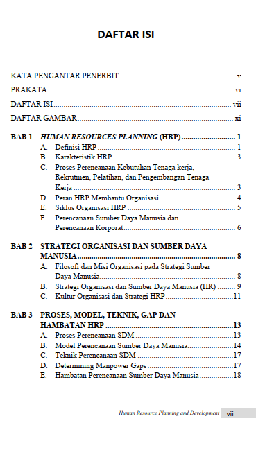 Buku Human Resource Planning and Development ini menyajikan pemahaman tentang prinsip, strategi dan praktik yang diperlukan dalam membangun kerja sama dalam sebuah organisasi atau perusahaan. Human resource planning merupakan proses antisipasi dan pelaksanaan pergerakan karyawan di dalam dan di luar organisasi. Human resource planning dilakukan untuk mencapai pemanfaatan SDM yang optimal serta mempunyai jumlah dan jenis karyawan yang tepat untuk mencapai tujuan organisasi. Adanya human resource planning dapat mengurangi pergantian tenaga kerja yang berlebihan, absensi tinggi, dan meningkatkan produktivitas. Selanjutnya, Human Resources Development (HRD) adalah sub-fungsi yang paling proaktif dari spesialisasi ini; mulai dari tingkat identifikasi kebutuhan pelatihan, melakukan survei lapangan, dan benar- benar melakukan program pelatihan.