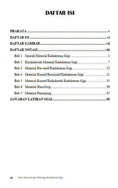 Buku Ilmu Material dan Teknologi Kedokteran Gigi ini terbagi ke dalam tujuh bab, dengan cakupan materi mencakup perkembangan sejarah material kedokteran gigi, karakteristik material, material preventif, material kuratif restoratif, material kuratif endodontik, material bleaching, serta material penunjang kedokteran gigi. Buku ini juga dilengkapi dengan latihan soal untuk menguji pemahaman pembaca terhadap materi yang telah dipelajari. Semoga buku ini dapat menjadi referensi yang bermanfaat di bidang material kedokteran gigi, serta mendukung kesuksesan prosedur kedokteran gigi yang aman dan efektif. Selamat membaca!