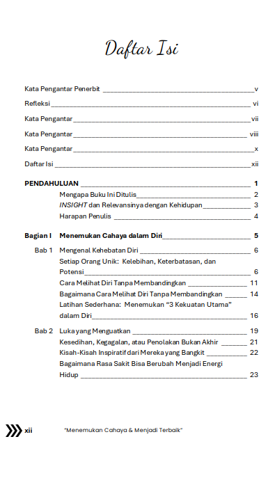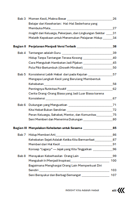 Setiap manusia membawa cahaya kehebatan di dalam dirinya — kadang redup karena luka, kadang tertutup oleh keraguan, namun tidak pernah benar-benar padam. Buku INSIGHT: Kita Adalah Hebat mengajak Anda menapaki perjalanan batin untuk menemukan kembali kekuatan itu — melalui refleksi, kisah nyata, afirmasi positif, dan latihan sederhana yang dapat dilakukan setiap hari.