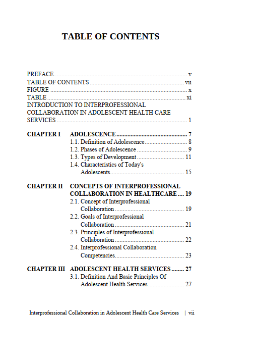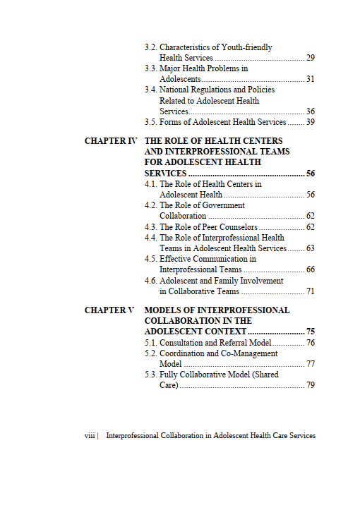 This book titled Interprofessional Collaboration in Adolescent Health Care Services is specially crafted to serve as a useful reference for readers from the academic community, healthcare professionals, as well as the general public. Consisting of four chapters, this book presents material ranging from Adolescent Health Care Services (PKPR), policy implementation concepts, to interprofessional collaboration. Hopefully, this book can raise readers’ awareness of the importance of maintaining the health of teenagers who will become the next generation of the nation. Happy reading!