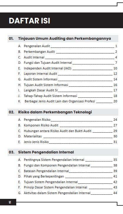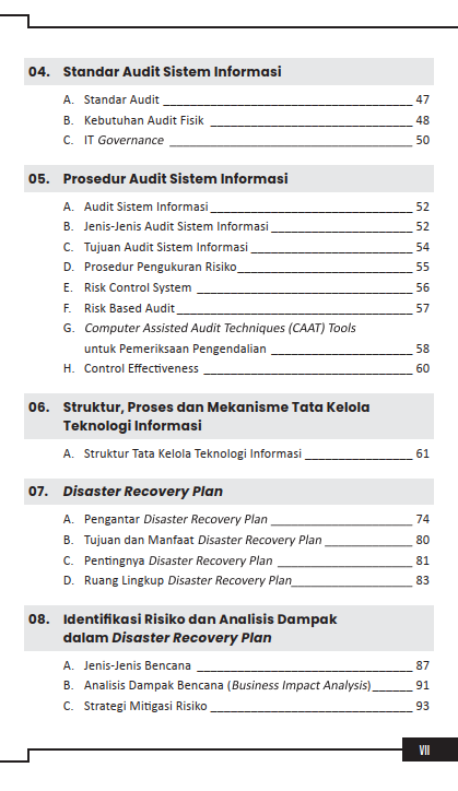 Buku Keamanan Teknologi Informasi: Strategi Pemulihan, Audit, dan Manajemen Risiko ini disusun guna memberikan pemahaman yang mendalam tentang aspek-aspek penting dalam audit sistem informasi dan disaster recovery plan. Tersusun atas tiga belas bab, buku ini menyajikan materi mulai dari tinjauan umum auditing dan perkembangannya; risiko dalam perkembangan teknologi; sistem pengendalian internal; standar audit sistem informasi; prosedur audit sistem informasi; struktur, proses dan mekanisme tata kelola teknologi informasi; disaster recovery plan; identifikasi risiko dan analisis dampak dalam disaster recovery plan; komponen utama disaster recovery plan; tahapan dalam pengembangan disaster recovery plan; strategi pemulihan dan reintegrasi; dokumentasi dan pelaporan dalam disaster recovery plan; hingga peran dan arah strategis disaster recovery plan. Semoga buku ini mampu memberikan manfaat berupa tambahan informasi dan wawasan kepada segenap pembaca, baik dari kalangan akademisi maupun pembaca umum yang lebih luas. Selamat membaca!
