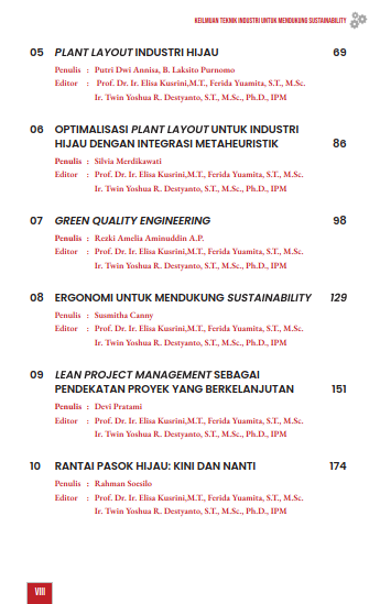 Buku berjudul Keilmuan Teknik Industri untuk Mendukung Sustainabilityini hadir untuk memperkaya khazanah kepustakaan dan keilmuan di bidang Teknik Industri. Tersusun atas enam belas bab, buku ini menyajikan informasi meliputi peran strategis teknik industri pada konsep sustainability,perancangan dan pengukuran kerja yang berkelanjutan, riset dan analisis operasi dalam kasus keberlanjutan, implementasi ekonomi sirkular dan tinjauan rekayasa ekonomi pada UMKM cocopeat di Indonesia, plant layout industri hijau, optimalisasi plant layout untuk industri hijau dengan integrasi metaheuristik, green quality engineering,ergonomi untuk mendukung sustainability, lean project management sebagai pendekatan proyek yang berkelanjutan, rantai pasok hijau, kepemimpinan organisasi yang berkelanjutan, keberlanjutan melalui manajemen keamanan dan kesehatan kerja, data analytics for sustainability, green manufacturing engineering, inovasi desain alat kebersihan toilet ergonomis dan ramah lingkungan untuk keberlanjutan, hingga desain dan rekayasa sistem untuk energi terbarukan. Semoga buku ini dapat menjadi bacaan yang bermanfaat bagi segenap pembaca baik dari kalangan akademisi maupun pembaca umum yang ingin memperluas wawasan di bidang Teknik Industri. Selamat membaca!