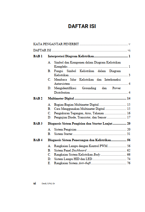 Di dalam buku ini, Anda dapat menemukan banyak contoh situasi nyata yang sering dijumpai saat bekerja dengan sistem kelistrikan kendaraan. Mulai dari membaca diagram, menggunakan multimeter, hingga menelusuri masalah pada sistem pengisian, starter, lampu, dan panel kendaraan. Materi disusun agar Anda bisa memahami logika kerja setiap rangkaian sebelum masuk ke proses diagnosis dan perbaikan.