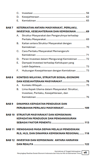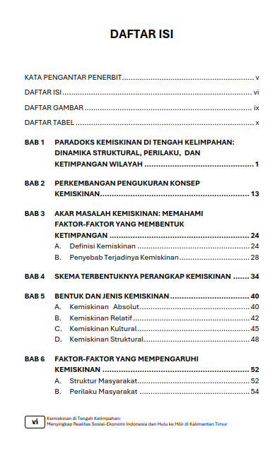 Buku ini mengajak pembaca menyelami ironi sosial yang terjadi di tengah limpahan sumber daya alam dan pertumbuhan ekonomi: kemiskinan yang membandel dan ketimpangan yang terus menganga. Buku ini memetakan dinamika kemiskinan dari sisi struktur masyarakat, perilaku sosial, hingga konteks wilayah. Pembaca diajak memahami sejarah dan perkembangan konsep pengukuran kemiskinan hingga bagaimana kemiskinan bisa menjadi lingkaran setan yang menjebak generasi demi generasi dalam perangkap struktural yang sulit diputus.