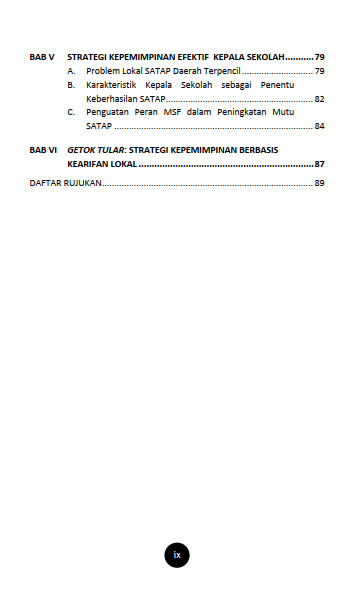 Buku ini mengungkap bagaimana strategi kepemimpinan kepala sekolah yang efektif dengan berbasis kearifan lokal bisa dijadikan kunci dalam mengelola dan meningkatkan mutu pendidikan, khususnya di daerah terpencil. Buku ini menyoroti tantangan yang dihadapi kepala SATAP, bagaimana faktor budaya, sosial, ekonomi, sampai geografis sangat berpengaruh terhadap keberhasilan kepemimpinan. Salah satu strategi utama yang dibahas adalah model “getok tular” atau penyebaran pengaruh melalui tokoh masyarakat yang dipercaya. Selain itu, buku ini menjelaskan tentang tiga peran utama kepala sekolah yang unggul, yaitu sebagai pemimpin perubahan, pemimpin spiritual, dan pemimpin entrepreneur. Oleh karena itu, buku menjadi referensi penting yang harus dibaca oleh kepala sekolah.