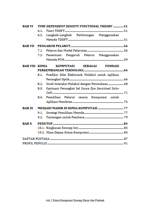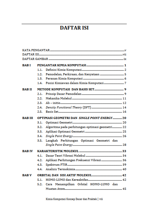 Buku Kimia Komputasi – Konsep Dasar dan Praktik ini disusun dengan tujuan memberikan penjelasan singkat, padat, dan disertai dengan praktik yang diharapkan membuat mahasiswa menjadi memiliki kepahaman menyeluruh mengenai peran kimia komputasi. Tersusun atas tujuh bab, buku ini mengajak pembaca untuk memahami konsep dasar perhitungan yang dilakukan di awal secara kimia dan langkah-langkah penerapannya dalam menyelesaikan masalah molekular. Selain itu, tantangan terhadap pembaca untuk mencoba sendiri apa yang telah dipelajari dengan molekul yang berbeda akan sangat membantu untuk menjadi jago dalam kimia komputasi. Semoga buku ini membantu akademisi ataupun mahasiswa yang ingin memahami konsep dan penerapan komputasi. Selamat membaca!